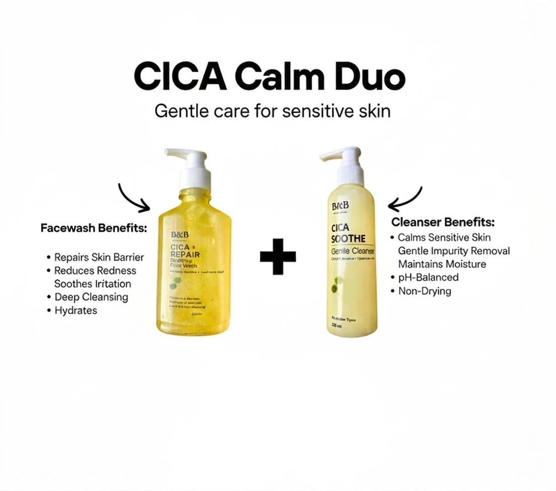 The Cica Glow Bundle brings together essential skincare products that work in harmony to soothe, strengthen, and improve the look of teen skin. Instead of using separate products that may not complement each other, this bundle gives a balanced routine designed to support a clearer, calmer, and more comfortable complexion. At the core of the bundle is the calming power of cica, a gentle botanical known for relieving irritation and helping reduce redness. Each product in this bundle supports the skin’s natural protective barrier while providing continuous nourishment. This set is ideal for teens experiencing sensitivity, occasional breakouts, uneven texture, or dryness. The balanced combination of products works to: