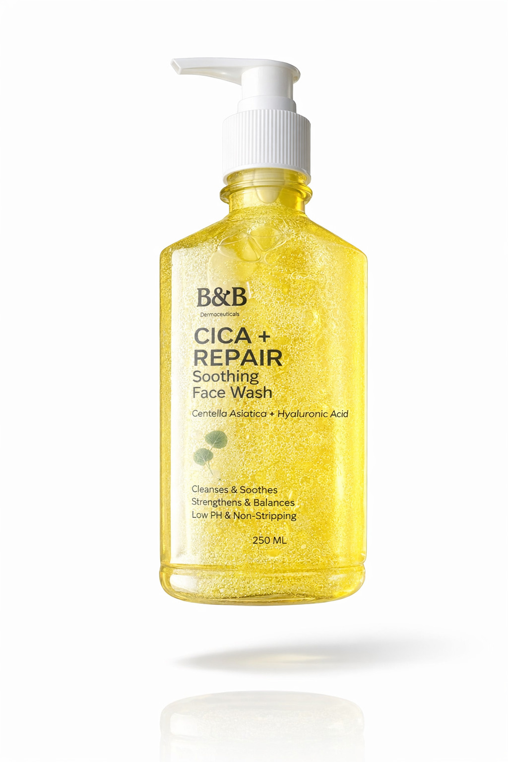 Introducing CICA + REPAIR Soothing Face Wash We are excited to announce the launch of our latest skincare innovation, the CICA + REPAIR Soothing Face Wash. This meticulously crafted face wash combines the potent healing properties of Centella Asiatica (Cica) with the intense hydration benefits of Hyaluronic Acid, offering a comprehensive solution for all your skincare needs. Key Benefits: Cleanses & Soothes The CICA + REPAIR Soothing Face Wash effectively removes dirt, oil, and impurities from your skin, ensuring a deep cleanse without stripping away natural moisture. Centella Asiatica, known for its powerful anti-inflammatory properties, calms irritated skin and reduces redness, making it ideal for sensitive skin types. Brightens & Balances This face wash helps even out skin tone and brighten your complexion. By balancing oil production, it ensures your skin maintains a healthy, radiant glow throughout the day. Hydrates & Plumps Formulated with Hyaluronic Acid, this face wash provides deep hydration, locking in moisture to keep your skin plump and soft. It helps maintain your skin’s natural moisture balance, preventing dryness and dehydration. Repairs & Heals Centella Asiatica promotes skin healing and repair, reducing the appearance of acne scars and other imperfections. It supports skin regeneration, enhancing your skin’s overall texture and resilience. Low pH & Non-Stripping Our face wash has a low pH formula that maintains your skin’s natural acidity, preserving its protective barrier. This non-stripping formula ensures a gentle cleanse that doesn’t compromise the skin’s integrity, making it perfect for daily use. Reduces Redness & Sensitivity The anti-inflammatory properties of Centella Asiatica help to soothe redness and reduce sensitivity, providing comfort to easily irritated skin. It’s an excellent choice for those with reactive or sensitive skin. Suitable for All Skin Types This versatile face wash is suitable for all skin types, including dry, oily, sensitive, and combination skin. It adapts to your skin’s needs, ensuring optimal care and cleanliness. How to Use: 1.Wet your face with lukewarm water. 2.Apply a small amount of face wash to your hands and lather. 3.Gently massage onto your face in circular motions, avoiding the eye area. 4.Rinse thoroughly with water and pat dry. 5.Use morning and night for best results.