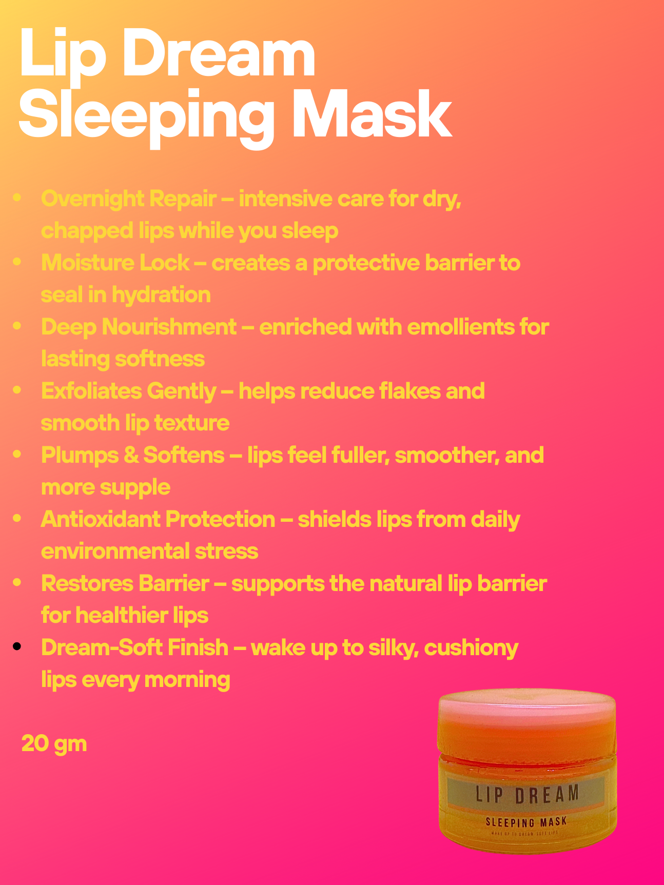 Designed as a moisture-sealing wrap, the Lip Dream Sleeping Mask locks in hydration, smooths away flakiness, and restores natural softness by morning. Enriched with Shea Butter, Hyaluronic Acid, Squalane, and Vitamin E, this nourishing blend delivers deep hydration, strengthens the lip barrier, and leaves your lips supple, cushiony, and visibly healthier. Whether applied as the final step in your night routine or used daily as a rich lip balm, it ensures long-lasting comfort and radiant lips.