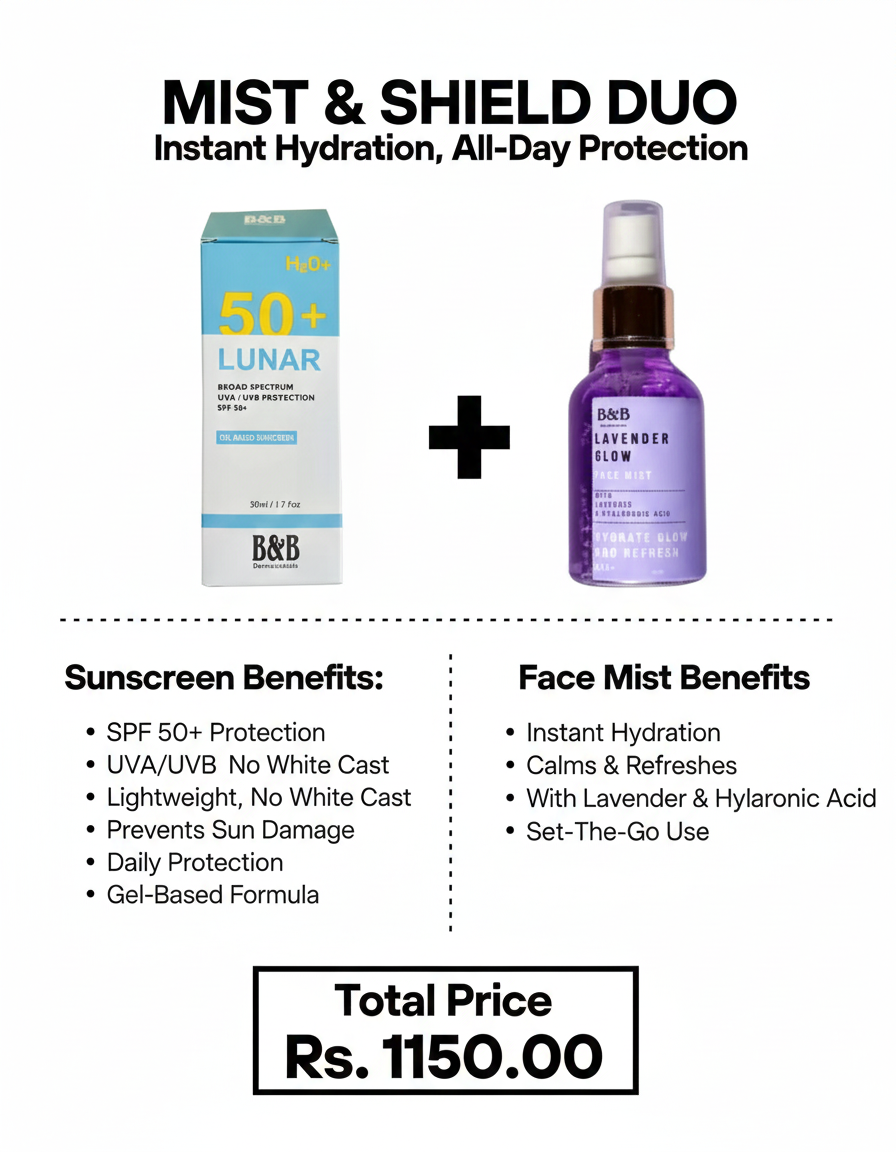 INCLUDES LUNAR GEL SUNSCREEN + FACE MIST ( CHOOSE FROM 9 FLAVOUR) 9 flavours 🍊Orange Blossom 💜Lavender Glow 💞Peppermint Swirl 🍓Strawberry Swizzle 🌹Rose Dewy 💧Hyalu-Water 🍉Watermelon glow 🥒Cucumber Water 🍑Peach squeeze Rs. 250 each or buy 3 for Rs. 650s Lunar Gel Sunscreen with Broad Spectrum SPF 50+ delivers superior broad spectrum UVA/UVB protection and hydration with a water-like, refreshing feel. The non-greasy sunscreen has a light, clean feel and layers invisibly under makeup. It boosts skin’s hydration level and locks it in all day. Our Sunscreen with Broad Spectrum SPF 50 is oil-free and non-comedogenic, which means it won’t clog pores. Hyalu water 250 each Formulated with Hyaluronic Acid, known as nature’s “moisture magnet”, the facial mist provides an instant burst of hydration, and can be used throughout the day to revitalize skin for a radiant, dewy complexion.