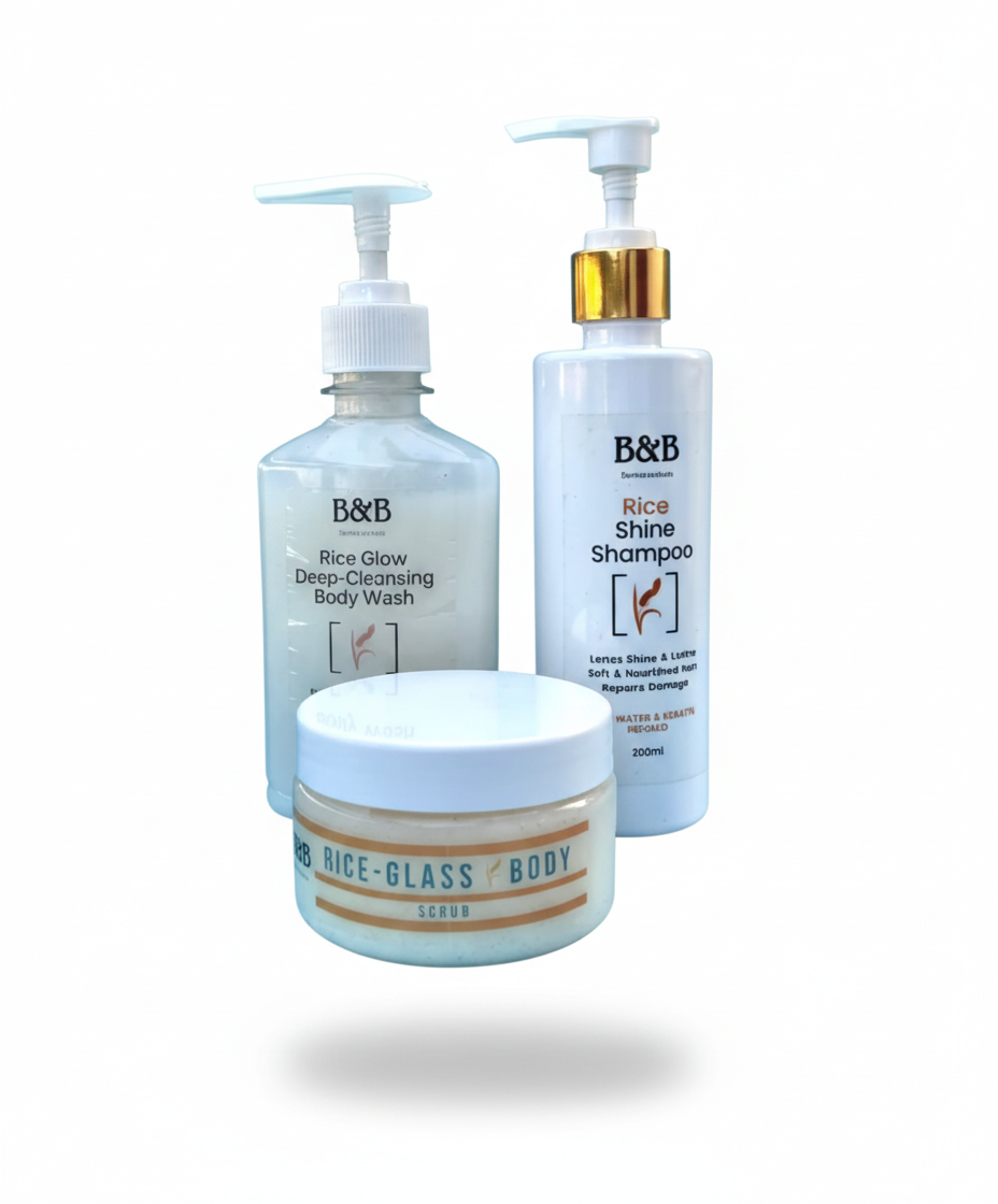 Indulge in the luxurious Rice Glass Hair and Body Kit for an immersive self-care experience priced at just Rs 2550. This exquisite kit features a trio of nourishing essentials: 🌾 **Rice-Shine Shampoo:** Unveil the natural radiance of your hair with our Rice-Shine Shampoo. Infused with the goodness of rice, it cleanses, strengthens, and adds a brilliant shine for hair that's both healthy and lustrous. 🌾 **Rice-Glass Body Scrub:** Pamper your skin with the Rice-Glass Body Scrub, a gentle exfoliator that buffs away impurities, leaving your skin soft, smooth, and glowing. Revel in the renewing sensation of rice grains delicately cleansing and revitalizing your body. 🌾 **Rice-Glass Deep Cleaning Body Wash:** Elevate your shower routine with the Rice-Glass Deep Cleaning Body Wash. Enriched with rice extracts, it deeply cleanses, hydrates, and imparts a refreshing fragrance, turning your daily shower into a rejuvenating ritual. Immerse yourself in the wholesome benefits of rice for both hair and body. The Rice Glass Hair and Body Kit is your passport to radiant, revitalized beauty. Grab this all-in-one indulgence at the exclusive price of Rs 2550. Elevate your self-care journey today! 🌟 #RiceGlassKit #HairAndBodyIndulgence #RadiantBeauty